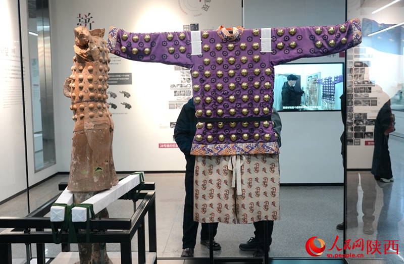 夏寅口中的PG电子官网这件俑,由173块残片粘接修复而成,通体遍布彩绘。一旁展陈的服饰,由秦始皇帝陵博物院与中国丝绸博物馆合作复原——紫色衣料上,缀着黑色八角纹与黄色泡钉,纹饰细腻灵动,生动复刻了秦代宫廷服饰的精致与华贵。