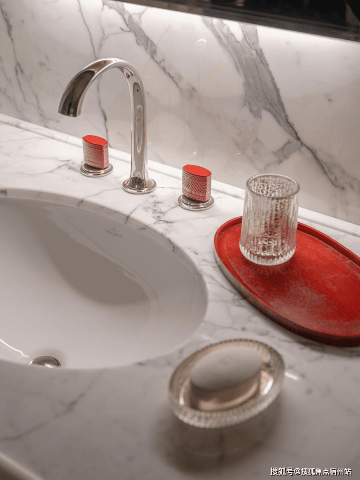 一抹亮色,从素雅的卫浴空间跳脱而出。来自白宫御用品牌Kallista(卡莉斯塔)的龙头套装,专为天潼198项目定制复古陶瓷红,华丽而传统的色泽,呼应着项目的红砖风貌。